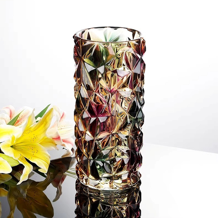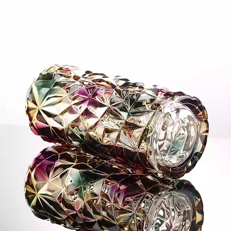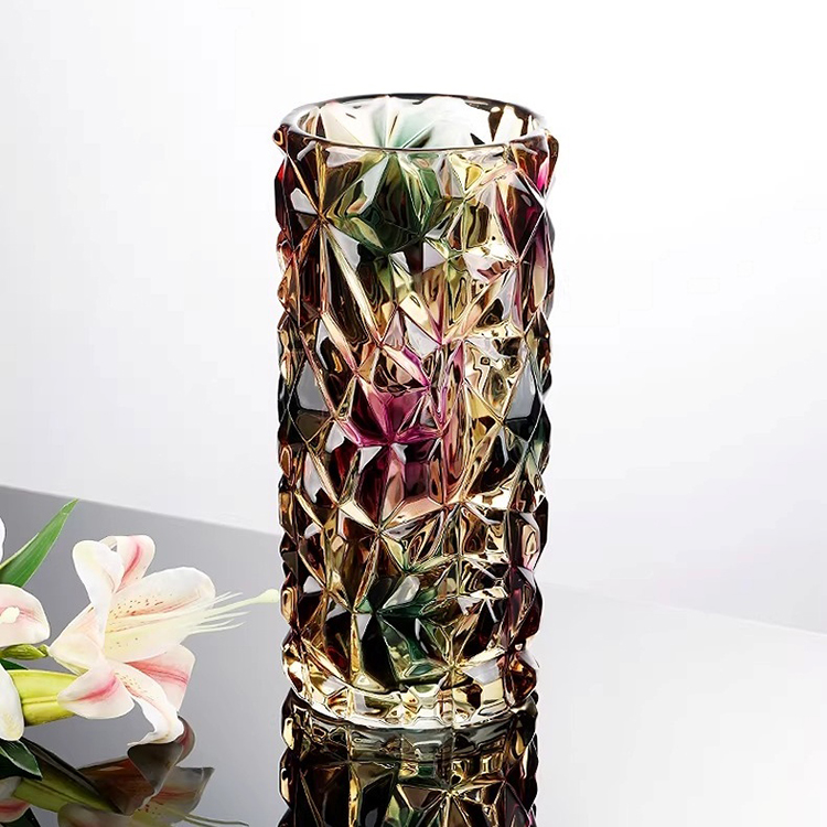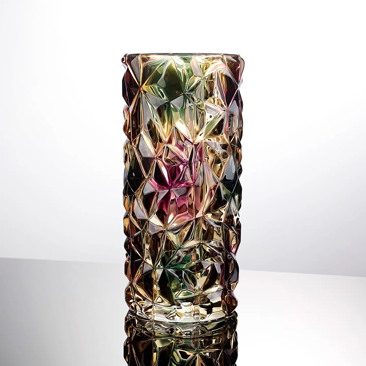 Bình hoa thủy tinh Aurora đa sắc HL6429 gây ấn tượng mạnh với thiết kế cắt khối đa diện tinh xảo, lấy cảm hứng từ hiện tượng cực quang Aurora rực rỡ. Bề mặt thủy tinh phản chiếu đa sắc vàng – hồng – xanh – tím, tạo hiệu ứng ánh sáng lấp lánh và chiều sâu thị giác nổi bật dưới mọi góc nhìn.