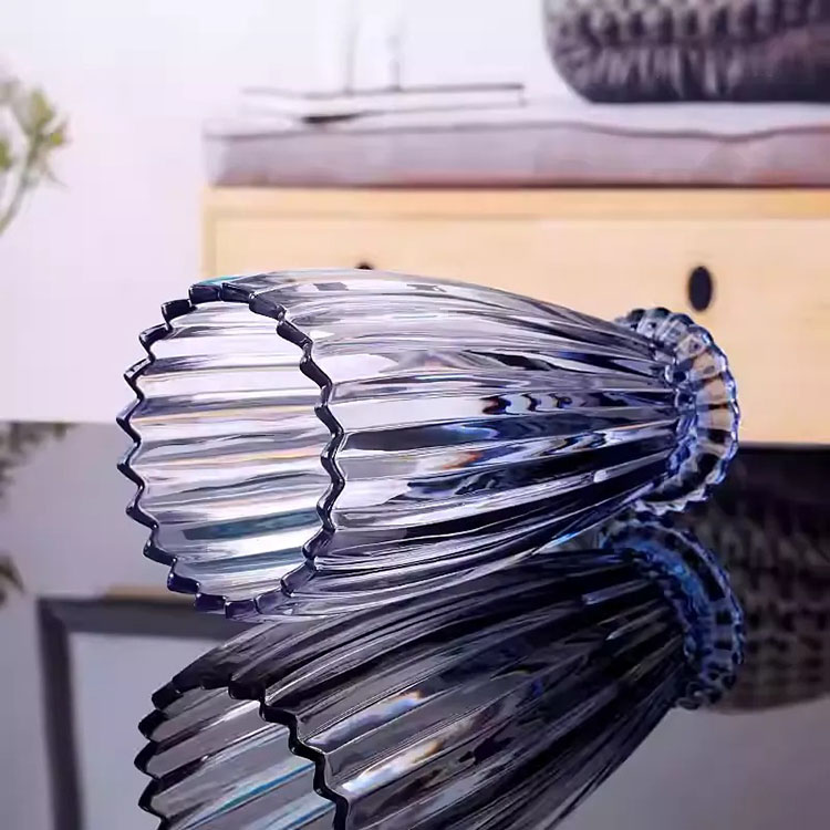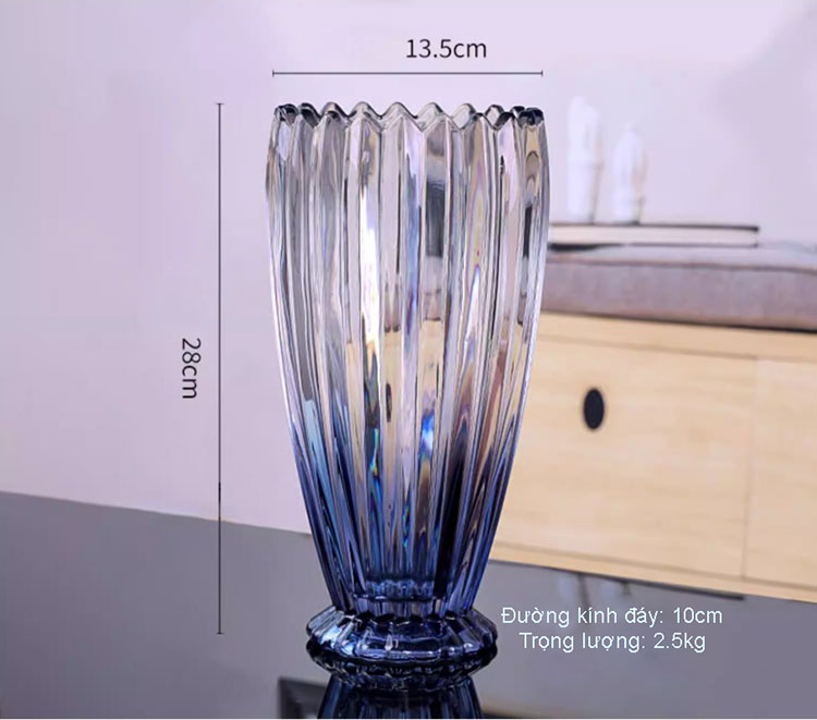 Thân bình được chế tác từ thủy tinh cao cấp, dày dặn và trong suốt, cho khả năng bắt sáng tốt, tạo hiệu ứng phản chiếu lung linh khi đặt dưới ánh đèn hoặc ánh sáng tự nhiên. Phần chân đế bo tròn vững chắc, giúp bình đứng cân đối và tăng cảm giác cao cấp khi trưng bày.