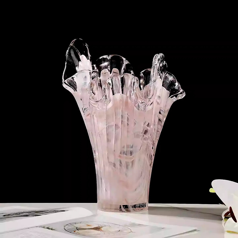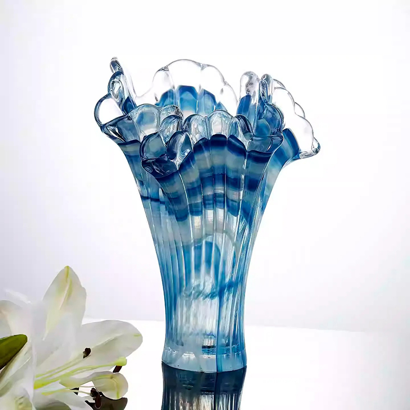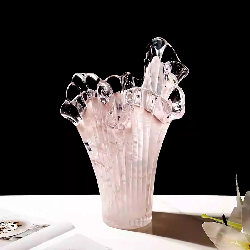 Bình thủy tinh nghệ thuật HL936 sở hữu thiết kế mô phỏng cánh hoa nở bung mềm mại, với những đường gợn sóng tinh xảo mang đậm dấu ấn của nghệ thuật chế tác thủy tinh cao cấp. Từng nếp uốn được xử lý tỉ mỉ, tạo hiệu ứng thị giác uyển chuyển như dòng lụa trong suốt, vừa thanh thoát vừa đầy tính sáng tạo.