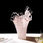 Phần thân bình được phối sắc hồng khói nhẹ, hòa quyện bên trong những lớp thủy tinh trong suốt, mang đến cảm giác huyền ảo, sang trọng và phù hợp với nhiều phong cách decor: hiện đại, nghệ thuật, tối giản hoặc bán cổ điển. Bề mặt gợn sóng phản chiếu ánh sáng cực đẹp, giúp HL936 nổi bật như một tác phẩm trưng bày dù có cắm hoa hay đặt riêng như món decor phòng khách, phòng ngủ hoặc bàn làm việc.