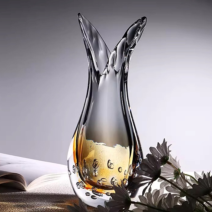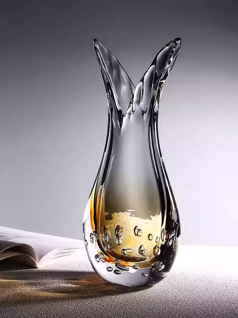 Bình được chế tác tỉ mỉ với kỹ thuật thủy tinh nghệ thuật cao cấp, từng đường cong, độ dày và hiệu ứng bọt khí đều được tạo nên bằng tay, mang đến vẻ đẹp độc bản, sang trọng và nổi bật trong mọi không gian. Hiệu ứng màu hổ phách – xám khói chuyển tiếp tự nhiên giúp sản phẩm phù hợp với nhiều phong cách decor từ hiện đại, Bắc Âu đến nghệ thuật sưu tầm.