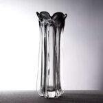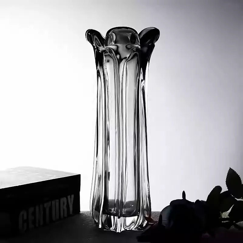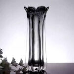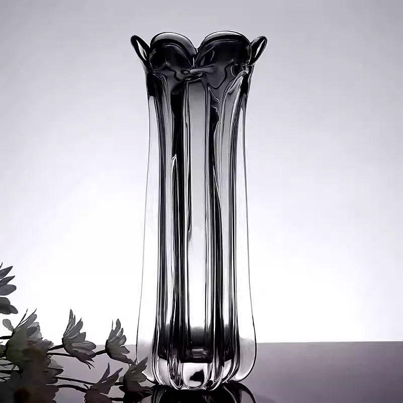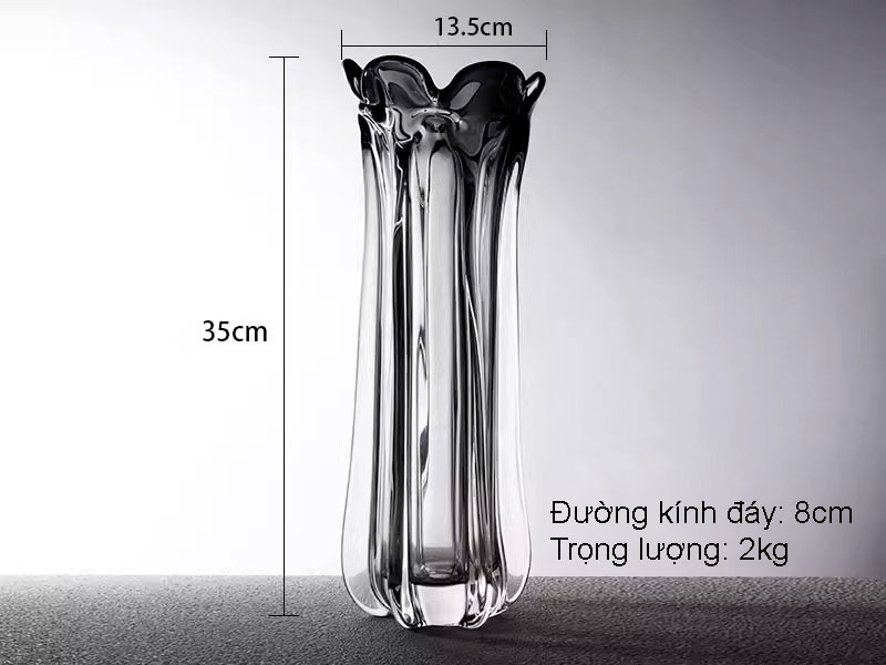 Phần miệng bình được tạo hình uốn lượn như cánh hoa nở, mềm mại nhưng đầy cá tính, giúp tổng thể trở nên cuốn hút ngay cả khi đặt độc lập không cần cắm hoa. Chất liệu thủy tinh cao cấp, trong suốt pha khói, được gia công dày dặn, bề mặt bóng mịn, phản chiếu ánh sáng đẹp mắt ở nhiều góc nhìn.