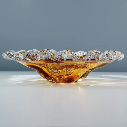 Đĩa trái cây HL5742 gây ấn tượng mạnh với thiết kế dáng thuyền thanh thoát, phần miệng uốn lượn mềm mại như cánh sóng, mang đậm tinh thần nghệ thuật và sang trọng. Điểm nhấn đặc biệt nằm ở lớp thủy tinh phối màu đa sắc ánh ngọc, tạo hiệu ứng chuyển màu tinh tế dưới ánh sáng, giúp mỗi góc nhìn đều trở nên cuốn hút.