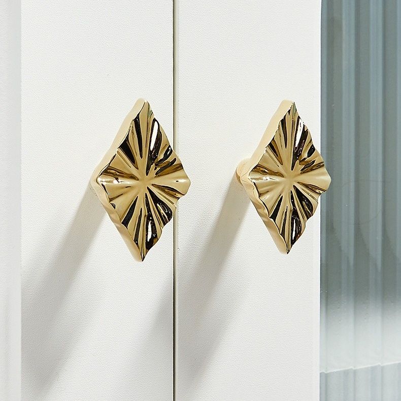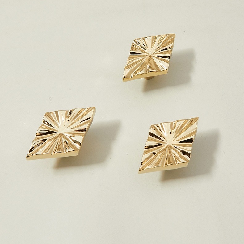 Núm tay nắm đồng thau KPA367 gây ấn tượng mạnh với thiết kế hình kim cương (Diamond) cùng các đường cắt ánh tia sắc sảo, tạo hiệu ứng phản chiếu lấp lánh như một viên đá quý dưới ánh sáng. Sắc vàng ánh kim sang trọng giúp sản phẩm trở thành điểm nhấn tinh tế trên bề mặt cánh tủ, ngăn kéo hay tủ trưng bày.
