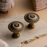 Sản phẩm núm tay nắm được chế tác từ đồng cao cấp với lớp hoàn thiện giả cổ, tạo chiều sâu màu sắc và cảm giác cổ điển đặc trưng. Viền hạt bao quanh cùng họa tiết cánh hoa lan tỏa từ tâm tạo nên tổng thể hài hòa, phù hợp với các phong cách nội thất vintage, retro đến tân cổ điển.