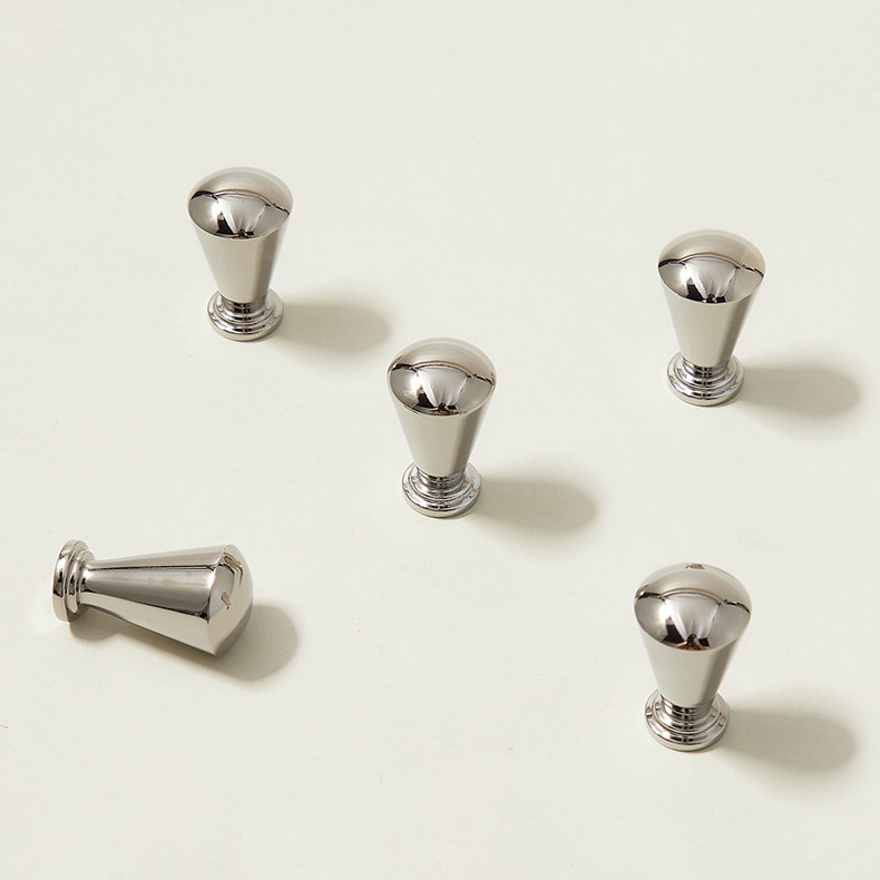Núm tay nắm tủ đồng thau màu bạc kiểu Pháp KPA827 gây ấn tượng với thiết kế dáng chuông thuôn thanh lịch, mang đậm tinh thần nội thất Pháp cổ điển nhưng được tiết chế vừa đủ để phù hợp với không gian hiện đại. Gam bạc ánh kim sang trọng kết hợp bề mặt hoàn thiện tinh xảo giúp núm tay nắm nổi bật trên nền gỗ tối, gỗ veneer hay cánh tủ sơn màu trung tính.