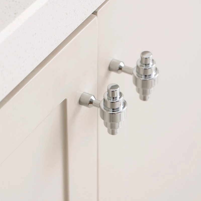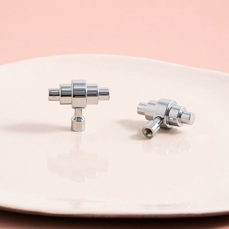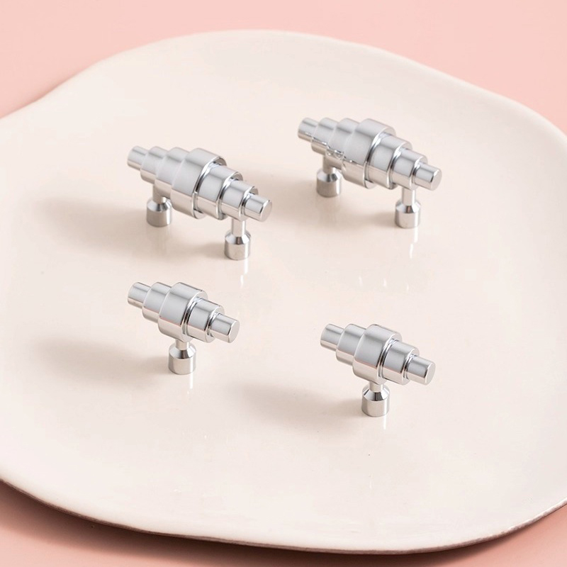 Núm tay nắm tủ đồng màu bạc Industrial JYJ412 mang đậm dấu ấn của phong cách công nghiệp hiện đại – mạnh mẽ, cá tính và đầy tính thẩm mỹ. Thiết kế dạng trụ nhiều tầng mô phỏng chi tiết cơ khí, kết hợp cùng chất liệu đồng thau nguyên khối mạ bạc bóng, tạo nên vẻ ngoài sang trọng, sắc nét và bền bỉ theo thời gian.