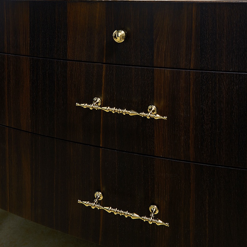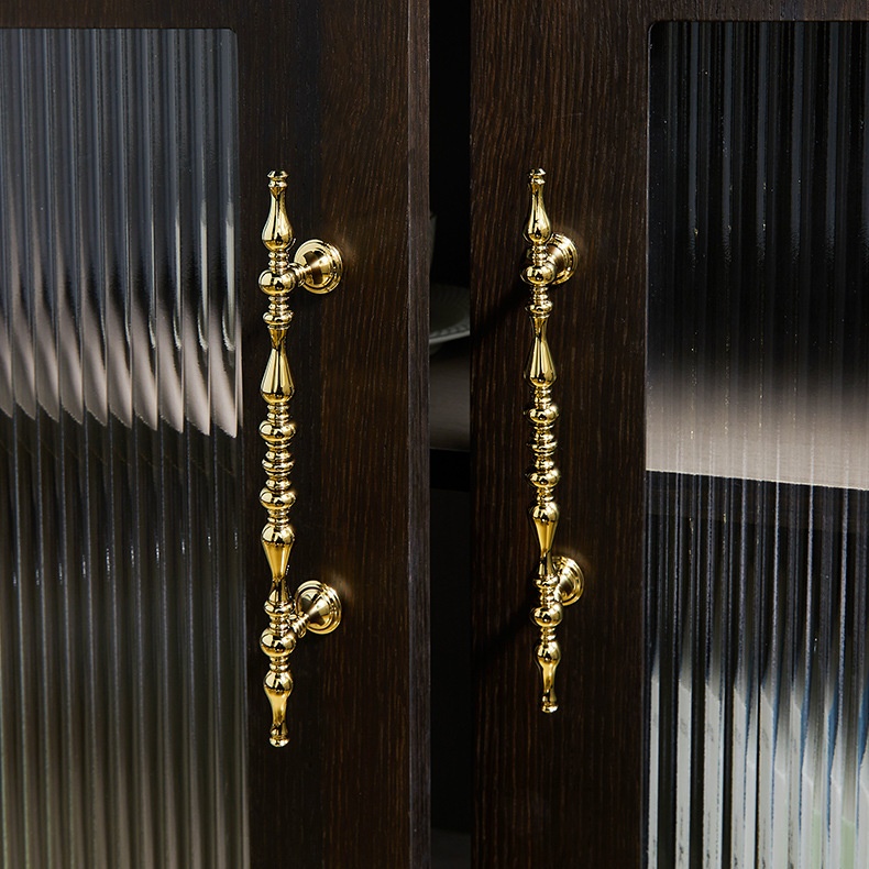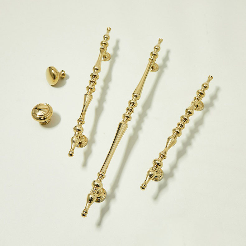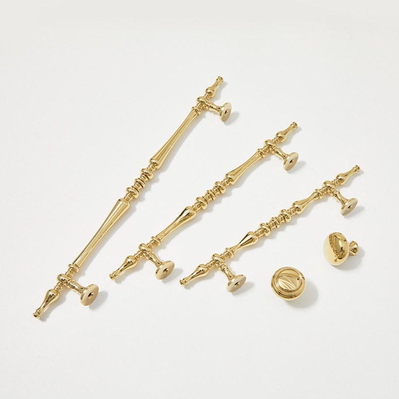 Tay nắm tủ đồng thau vàng bóng phong cách châu Âu KPA596 là dòng phụ kiện nội thất cao cấp mang đậm dấu ấn European Classic Luxury – sang trọng, tinh xảo và đầy khí chất quý tộc. Thiết kế tay nắm dạng thanh dài, các chi tiết phình – thắt đối xứng, đầu chóp bo tròn mềm mại gợi nhớ đến những cánh tủ trong các dinh thự châu Âu cổ điển, nơi từng chi tiết đều thể hiện gu thẩm mỹ tinh tế và đẳng cấp.