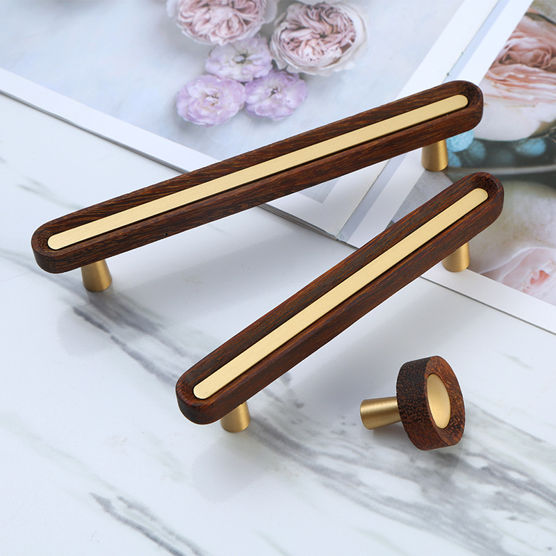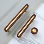 Tay nắm tủ WH882 gây ấn tượng với sự kết hợp tinh tế giữa gỗ tự nhiên vân sẫm ấm áp và đồng mạ vàng champagne sang trọng, tái hiện trọn vẹn tinh thần Bắc Âu hiện đại – tối giản nhưng giàu cảm xúc. Thiết kế dáng thanh dài bo tròn mềm mại, điểm nhấn kim loại chạy dọc thân tay nắm tạo nên nét chấm phá tinh xảo và khác biệt.